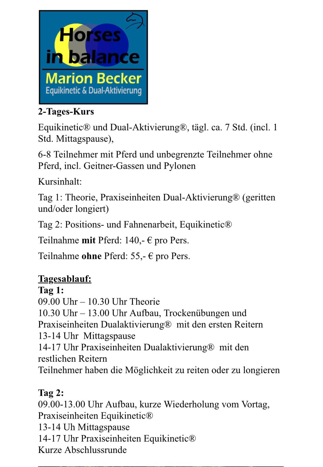 Vom 31.01.2026 bis 01.02.2026 findet ein Equikinetic/ Dual–Aktivierungskurs mit Marion Becker bei uns statt. Der Kurs ist für Pferde ab 2,5 Jahren geeignet. Vorkenntnisse sind nicht erforderlich. Über zahlreiche Anmeldungen bis zum 24.01.2026 unter info@zrufv.de würden wir uns freuen.